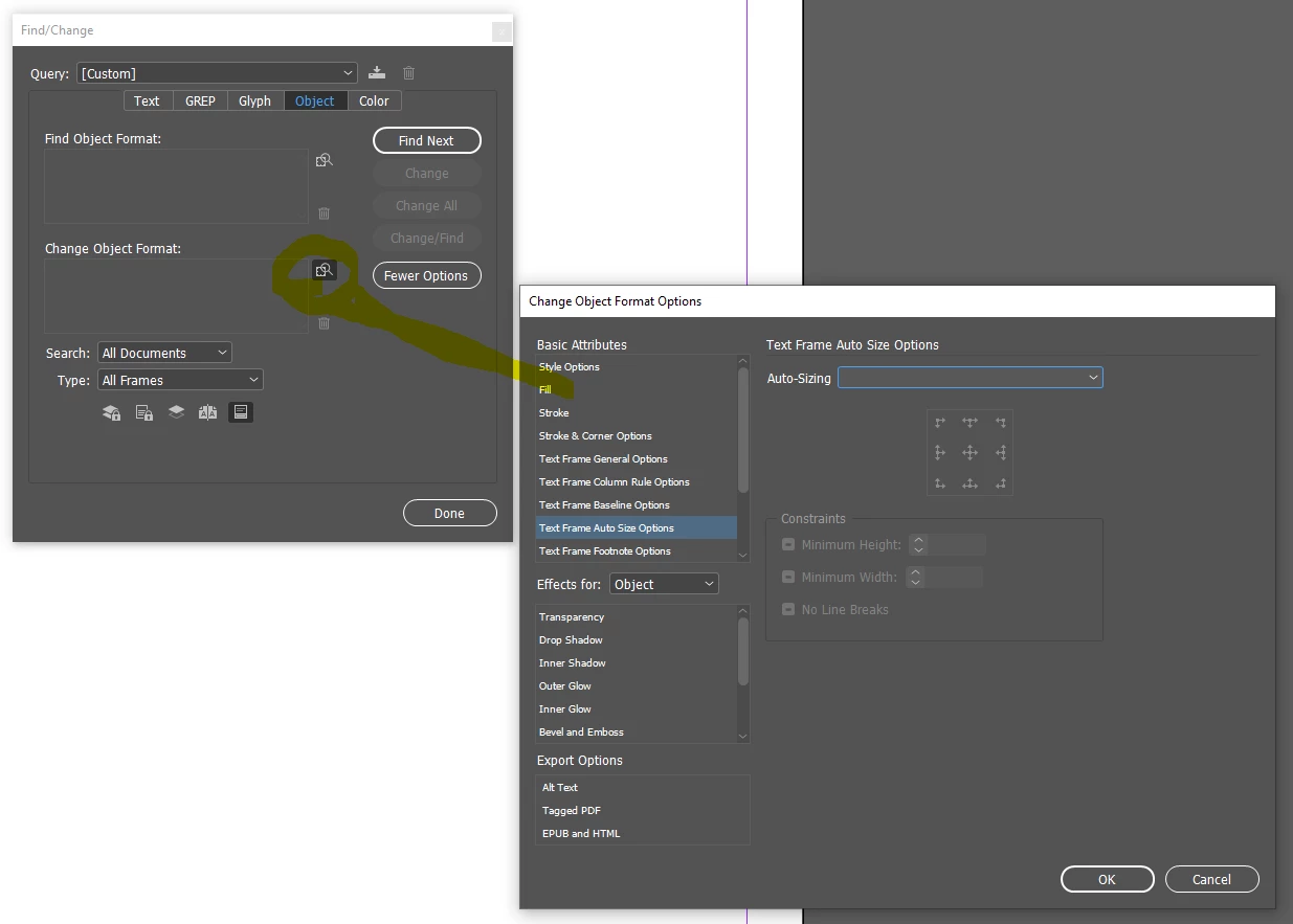 Hello everybody. In Find/Replace - object - general options text-frames, I only found the possibility to change the width, but not the height of the text-frames. Where is the option to change the height? Thanks to anyone who wants to help me.