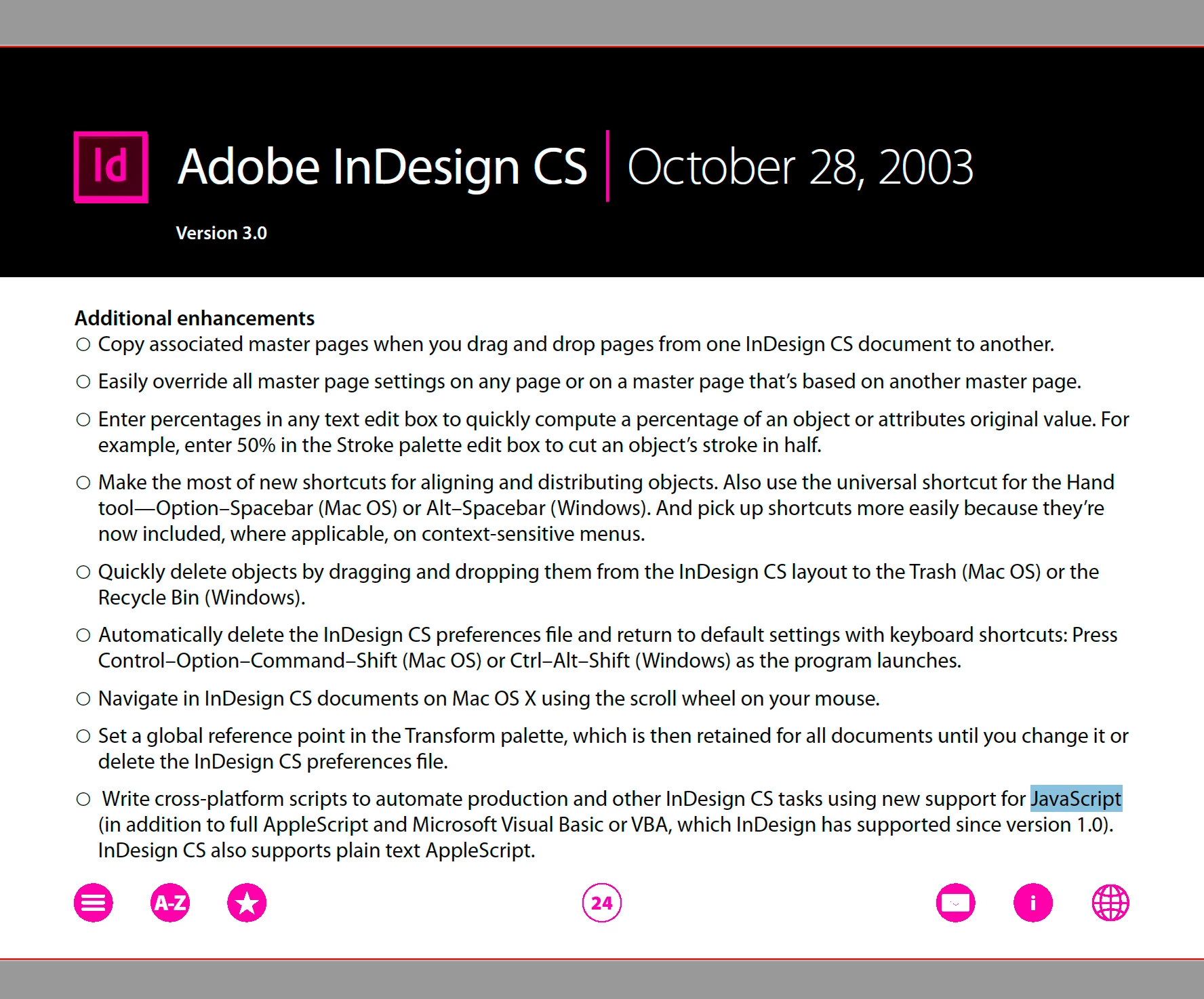 I believe Illustrator 10 (2001) began supporting scripting and I am sure Illustrator CS (2003) supported scripting. Those correspond to InDesign 1.5 and InDesign CS.  Does anyone know which version of InDesign began supporting scripting with Javascript?  Thanks in advance.