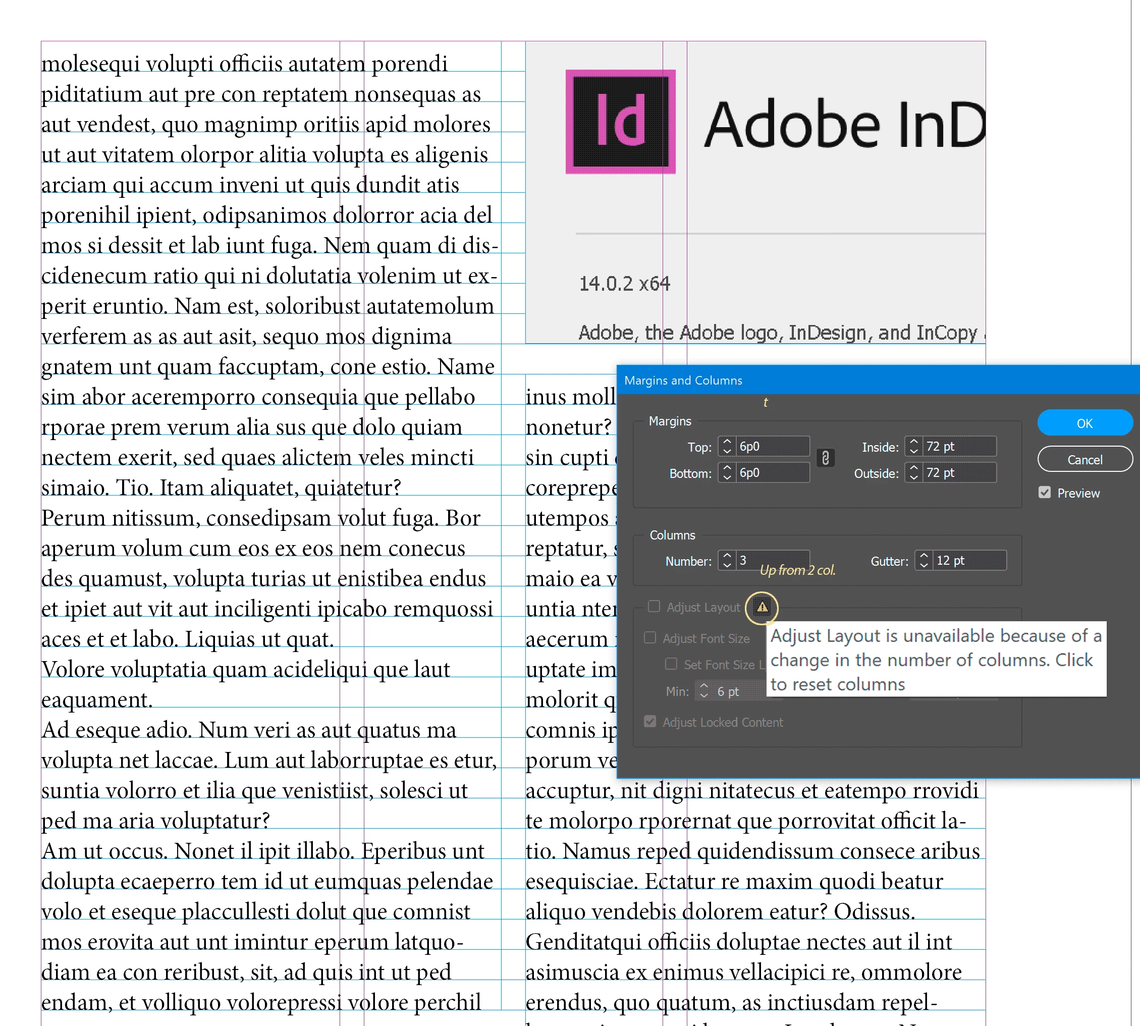 That’s expected — in InDesign 14.0.3 (CC 2019) the Adjust Layout checkbox is only active when you’re changing page size or margins in a way that would require objects to move/scale. When you change just the number of columns, InDesign disables it and shows the warning. If you want objects to realign to the new column setup, you’ll need to use Smart Guides or manually reflow them — Adjust Layout doesn’t apply to column count changes in that version.