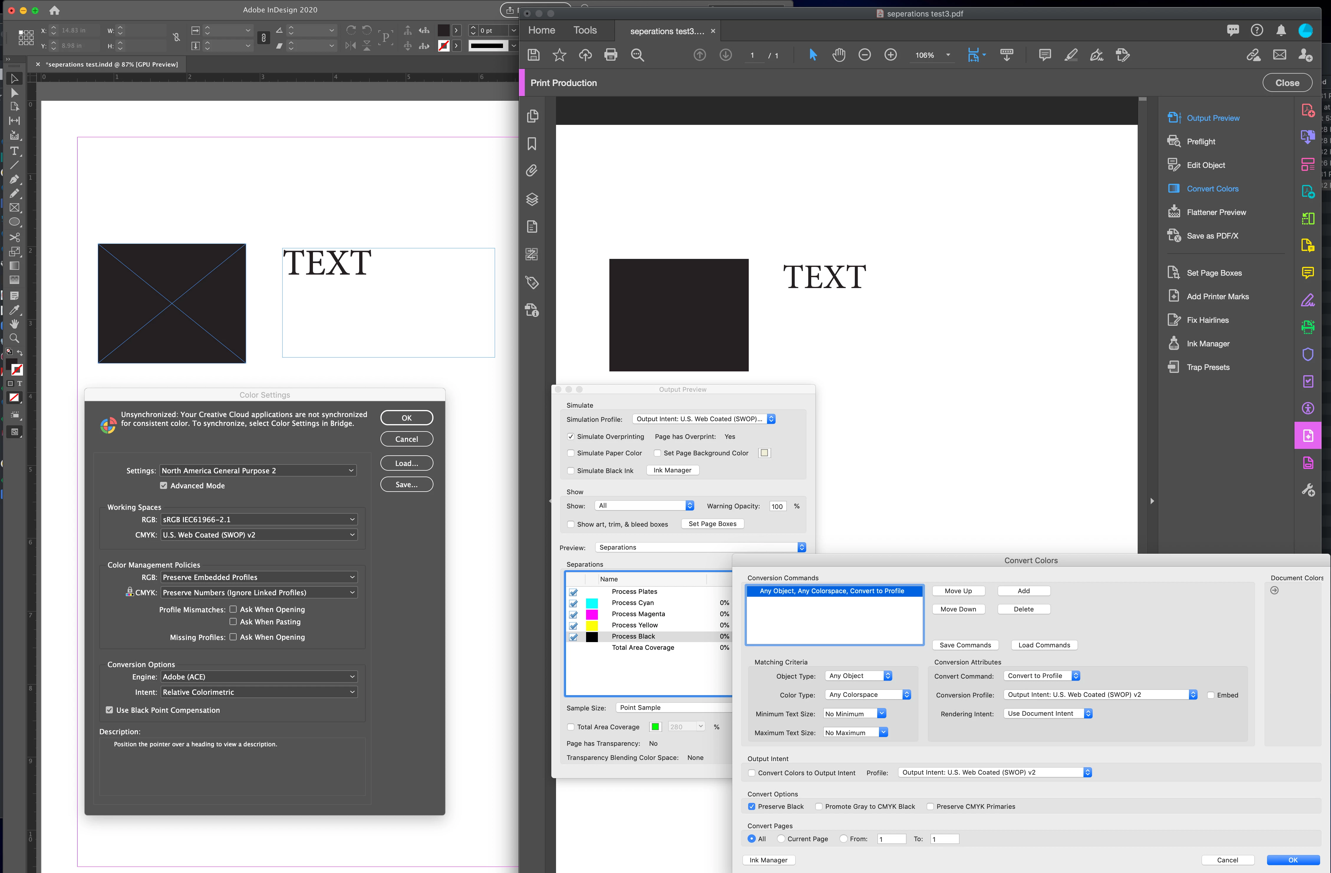 • I made sure I was using the same Simulation Profile in AcrobatPro and my Document CMYK profile