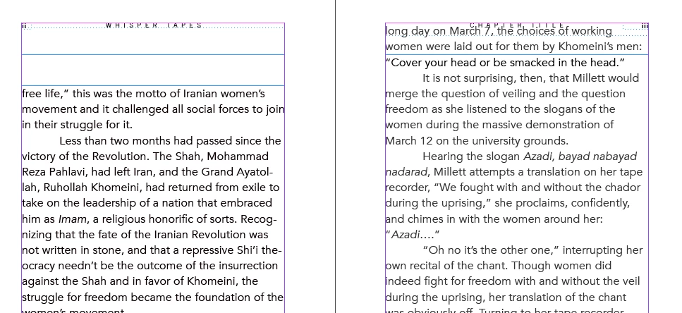 The master page, both verso and recto, is set up with text boxes that make a primary text flow.