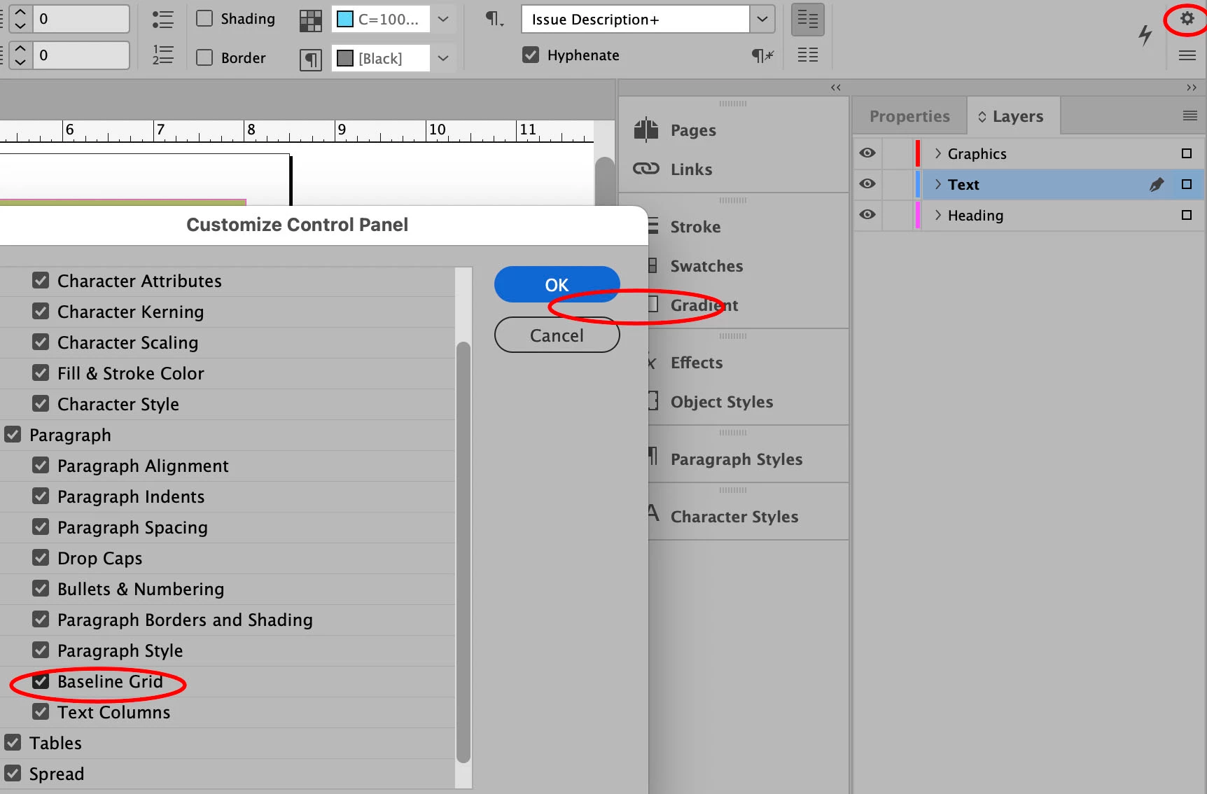 Go to the small "gear" icon at the right end of the Control Panel. When you click on it, you can customize what appears on the panel. You need to make sure the Baseline Grid option is checked.
