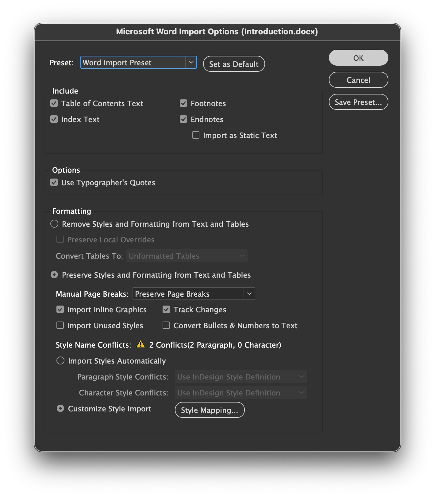 I am working with documents in a book. I compose each chapter in Word and import .DOCX to my .INDD using STYLE MAPPING. All my styles in use are accounted for.