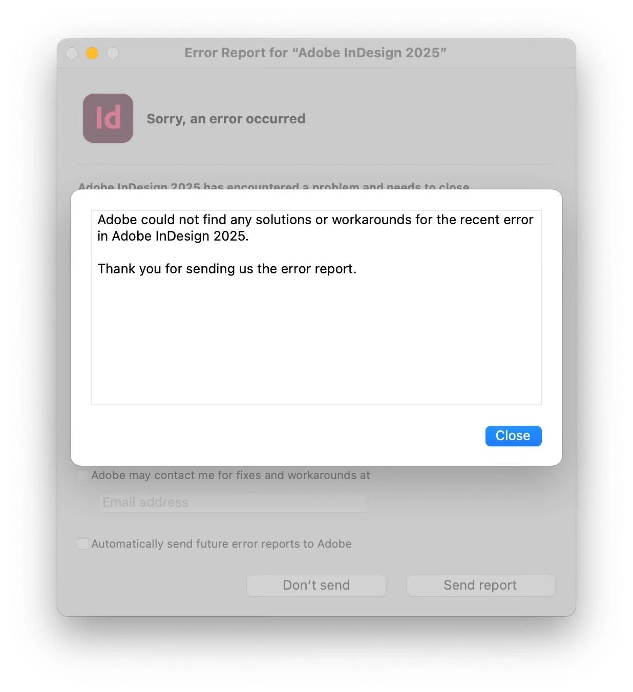 when I start INDESIGN this morning it shows me the screen "How likely is it that you would recommend INDESIGN..." and then it froze the image on the screen and I had to force close indesign.