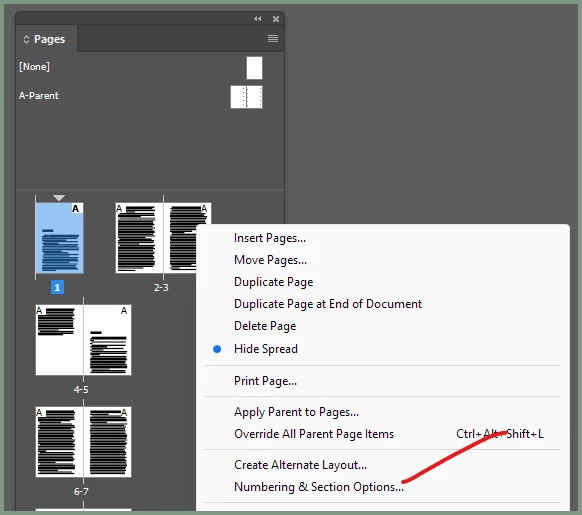 In the Pages pane, right-click on the document page (icon) where you want the new numbering to start. Click Numbering & Section Options: