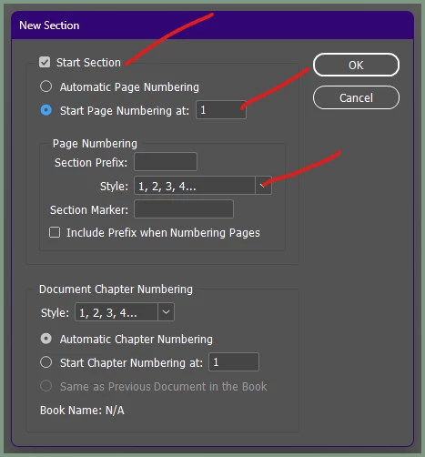 I am new to InDesign and teaching myself- had the entire book numbered- then I switched the entire book to be Roman numerals- then selected the page I wanted to begin having regular numbers but I cannot get the regular numbering to start with 1- when I type 1 into any of the available options it does this weird thing where it shuffles all of the pages down from the one I have selected?