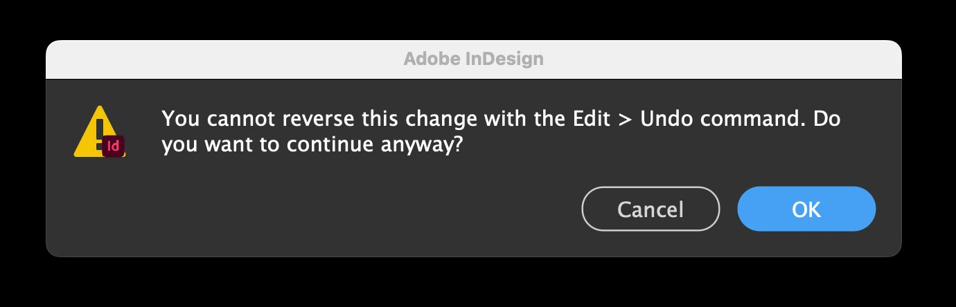 "You cannot reverse this change with the Edit > Undo command. Do you want to continue anyway? (Yes, No) every time I open InDesign now, this window pops up. It comes up again when (at a minimum) the first document is opened. There is nothing I am trying to undo. Any insight as to where this is coming from or how to fix it?