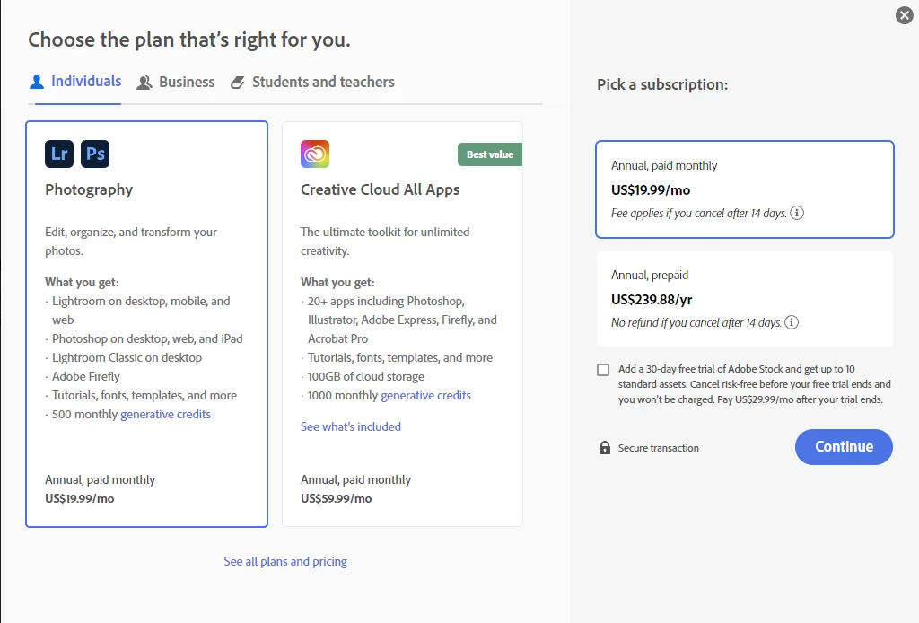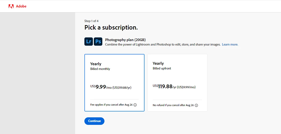 20gb photogaphy plan is difficult to find on the purchase page.