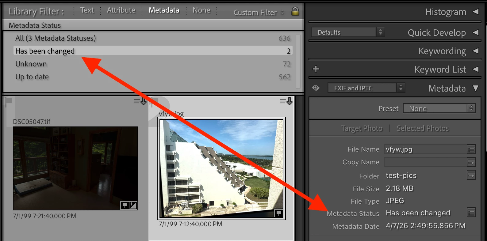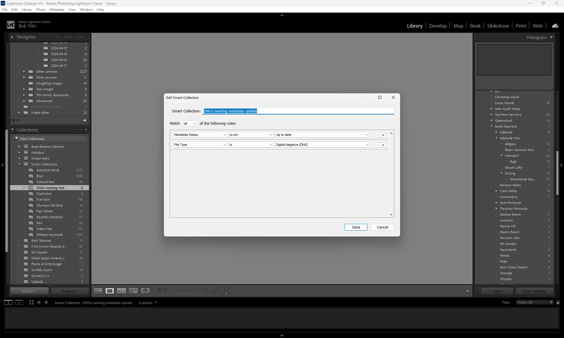 I have a smart collection definition that seeks out all images that show the down arrow labelled, “Metadata file need to be updated”. It was working fine for a long while but recently it ceased to pick up those files.