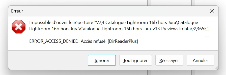Unable to open directory "V:\4 Catalogue Lightroom ...\Catalogue Lightroom ...\Catalogue Lightroom ...-v13 Previews.lrdata\3\365F".