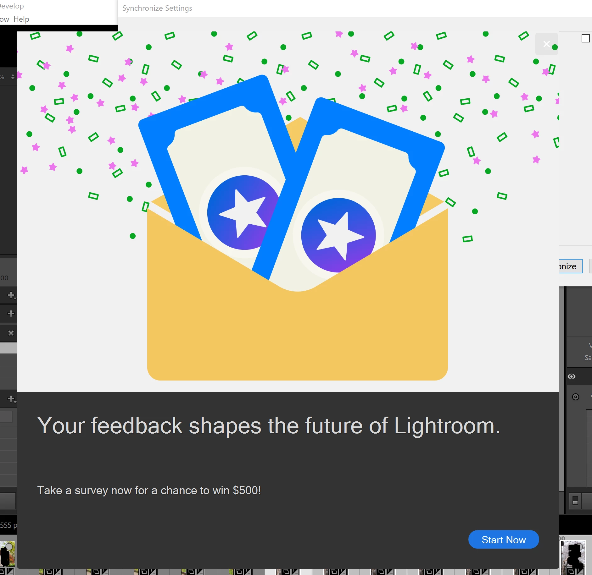 I can't remember ever seeing something like this before, but while using Lightroom Classic (13.2) on Windows 10 just now I got this giant popup when I was about to sync some settings across a bunch of photos: