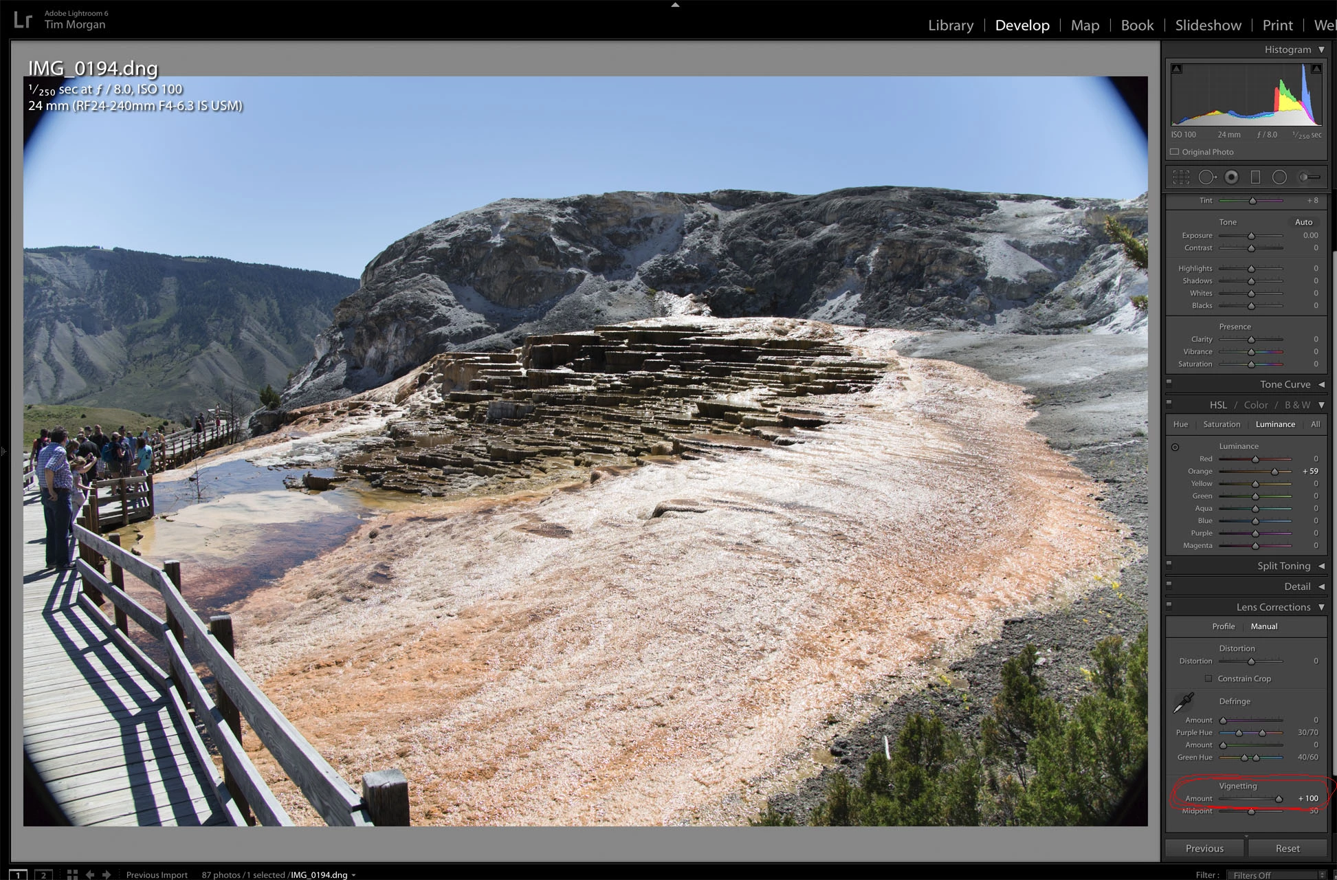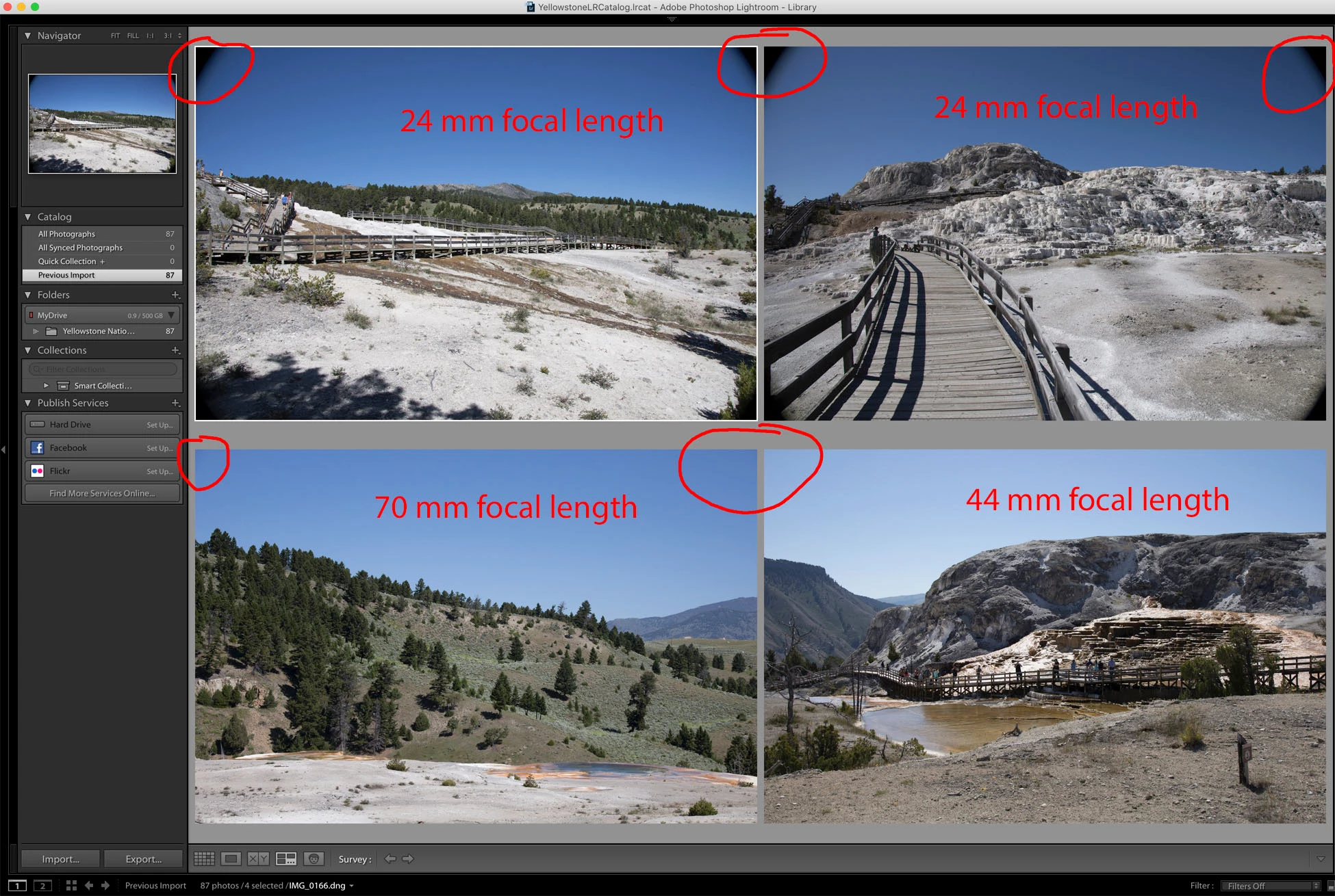 Here's a screen shot of photos with and without vignetting taken at 24mm and more zoomed focal lengths...