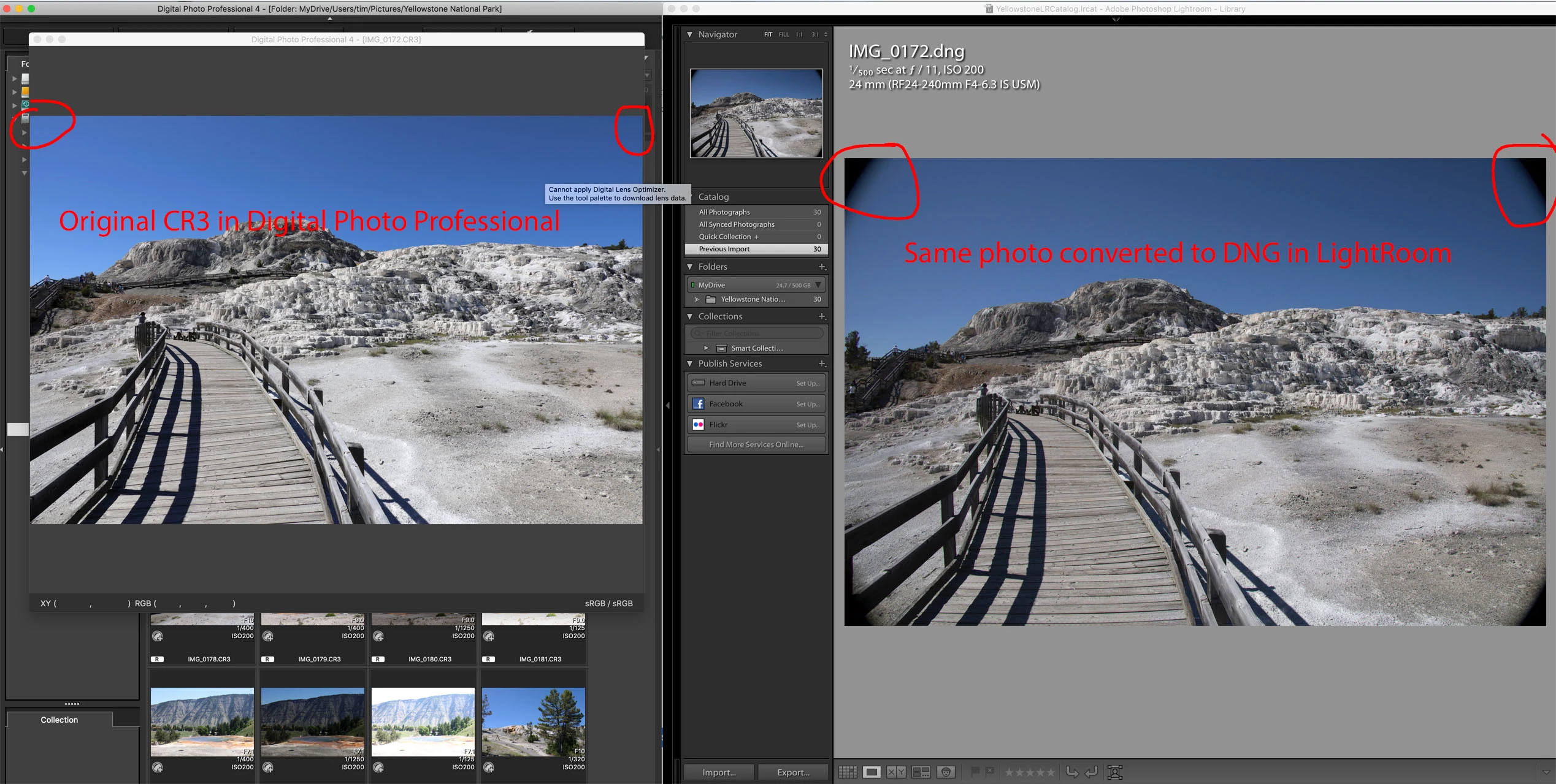 While the shot above may look like lens vignetting distortion, I think it's actually being introduced in the CR3->DNG conversion process by Adobe DNG Converter. Here's the same photo side-by-side in Canon Digitial Photo Professional in original CR3 version and Adobd DNG Converter converted DNG version.