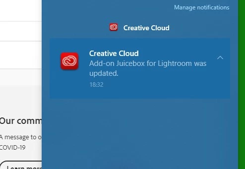 After recent Adobe CC Desktop update every time I restart my PC some old add-on (Web Gallerey called JuiceBox Lite)  is downloaded together with Windows Notifivation Center message