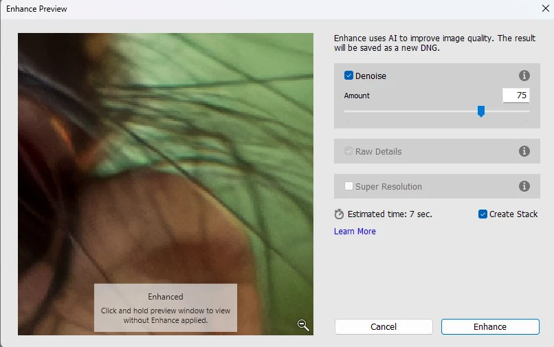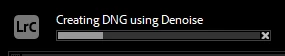 At times it will work properly, create the new DNG file and stack it with the original (as selected in the check box) but, in other random ocations it will process (according to the progress bar) and when it finishes, it closes the picture I'm working on and It tells me I dont have a photo selected. From there, I have to search for the picture again and the DNG won't be there. The edit continues where it was before the denoise.
