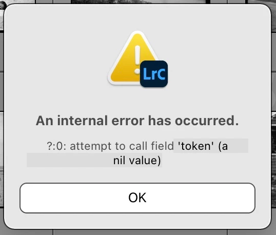 Recently purchased a 24" IMAC M1 2021 and transferred Lightroom to it from my previous MAC desktop. OS is 12.1 and LR version 11.2. Everything appears to function as it should except whenever I launch Lightroom and it opens I get a window with the following message "An internal error has occurred. ?:0: attempt to call field 'token' (a nil value). Clicking OK all appears to be fine but it's annoying. Any solutions?