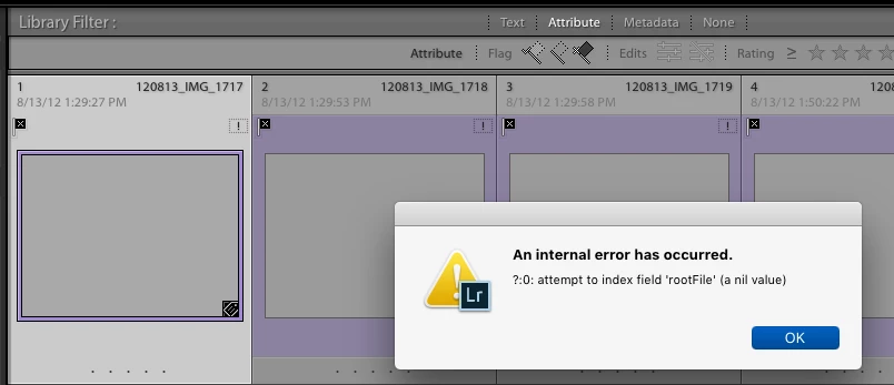 A number of catalog references turned up missing. Some to the point of having little or no catalog file information. At first, I thought these 'file missing' images were causing the 'nil reference' error. (they may still do that.)
