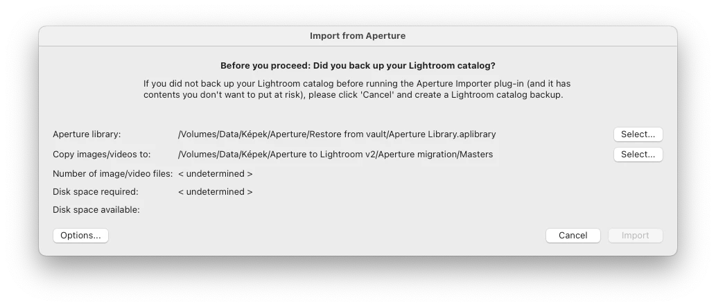 I am trying to import an Aperture library. It seems the importer cannot determine the number of files in my Aperture library and I cannot proceed with the import because the Import button is inactive as seen in the attached screenshot.