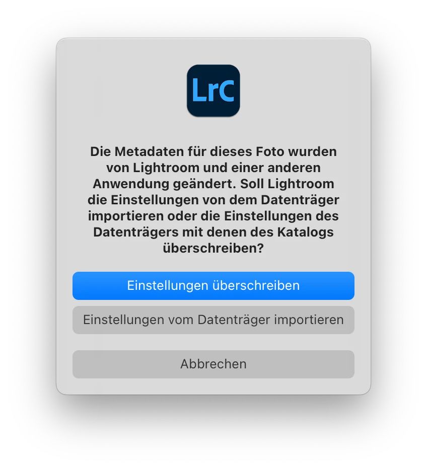 Egal, ob ich die Einstellungen überschreibe oder mit der zweiten Option die Einstellungen des Datenträgers importiere, erhalte ich den gleichen Effekt. Bearbeitete Fotos verlieren ihren Inhalte. Das heißt, alle Bearbeitungsschritte werden gelöscht und das Bild wird im RAW unbearbeitet angezeigt. Mit dem Ausrufezeichen werden sie bearbeitet angezeigt. Ich kann alle Bearbeitungsschritte sehen.