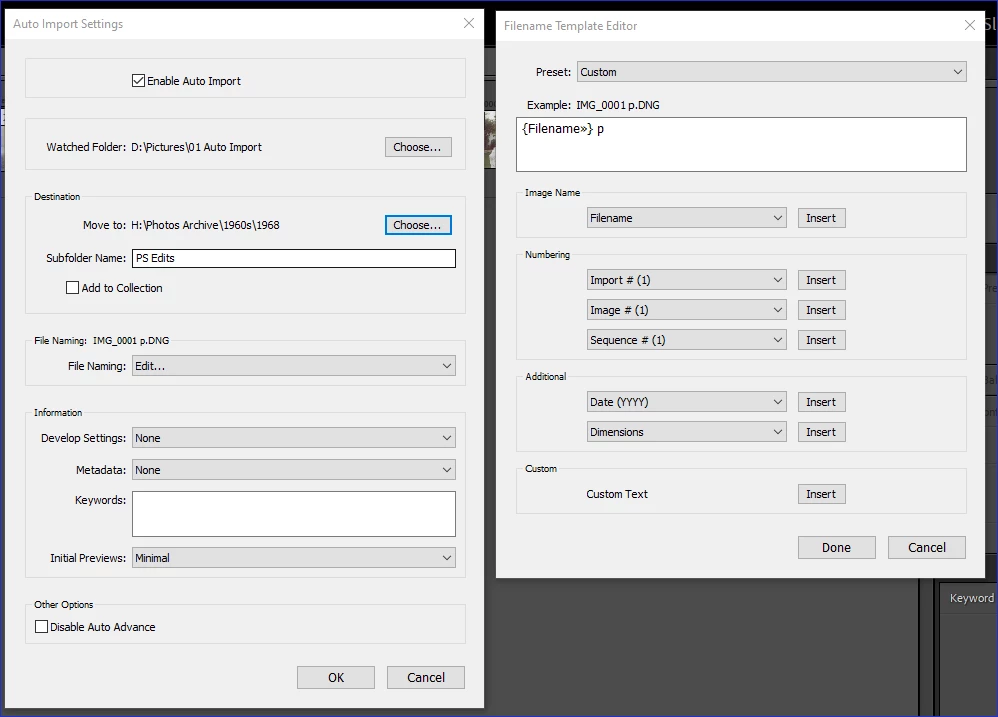 Move to Folder is specified as 'PS Edits', since I am editing PS (Beta version 26.1), and I have the file naming set to simply a space and the letter 'p' to the filename