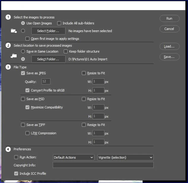 In Photoshop I select File>Scripts>Image Processor and process the file to be saved to the above 'Auto Import folder: