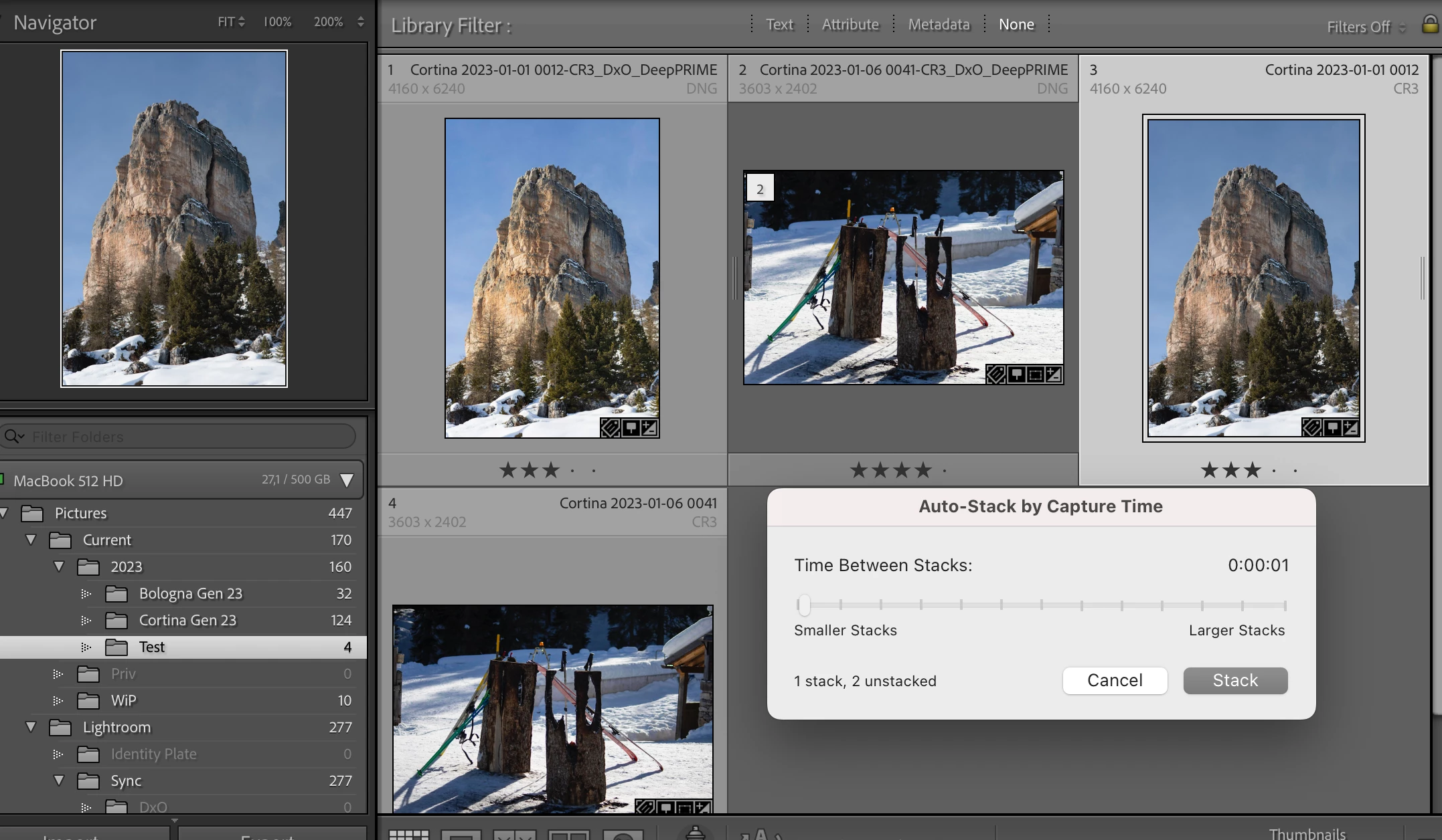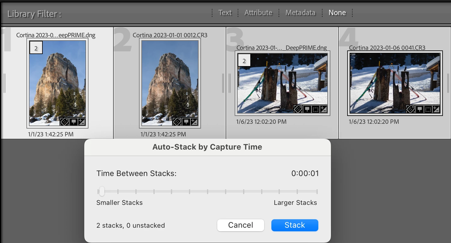 Auto stacking does not seem to work anymore. I have a folder with a bunch of CR3 raw photos and a DNG copy of each, created by DxO PureRAW 2. When I try to auto stack by capture time, 0 seconds as interval, no photos get stacked except the first one with the last one of the folder (incorrectly, of course). Prevously I got a stack for each CR3 + DNG photo, as expected. Any ideas?