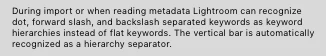 Lightroom does not display and recogize this as a hierarchical keyword. Even after I select the option edit\Preferences\FileHandling\Treat'/'AsAKeywordSeparator
