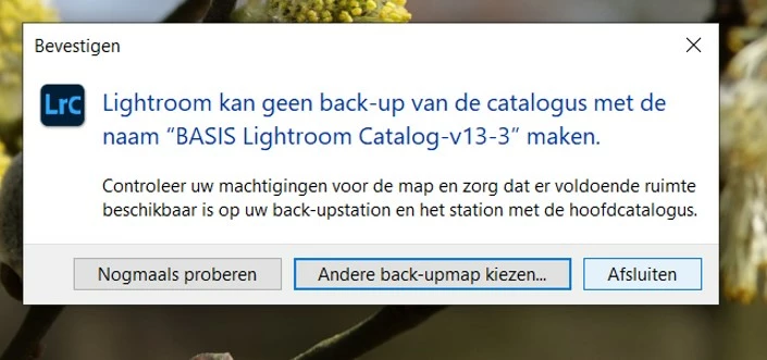 "Cannot make a backup (V13-3). Check your privaliges for the map and be aware there is sufficient space both on the backup-location as on the main map for Lightroom."