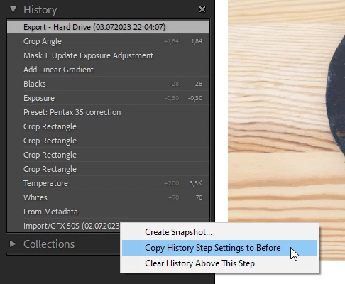 What happens if you right click the Import step in the History panel, and choose Copy history step settings to before?