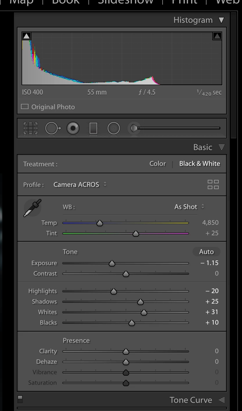 I've created a virtual copy of a color shot and applied a Fujifilm ACROS preset, which is black&white. As you can see from the image,