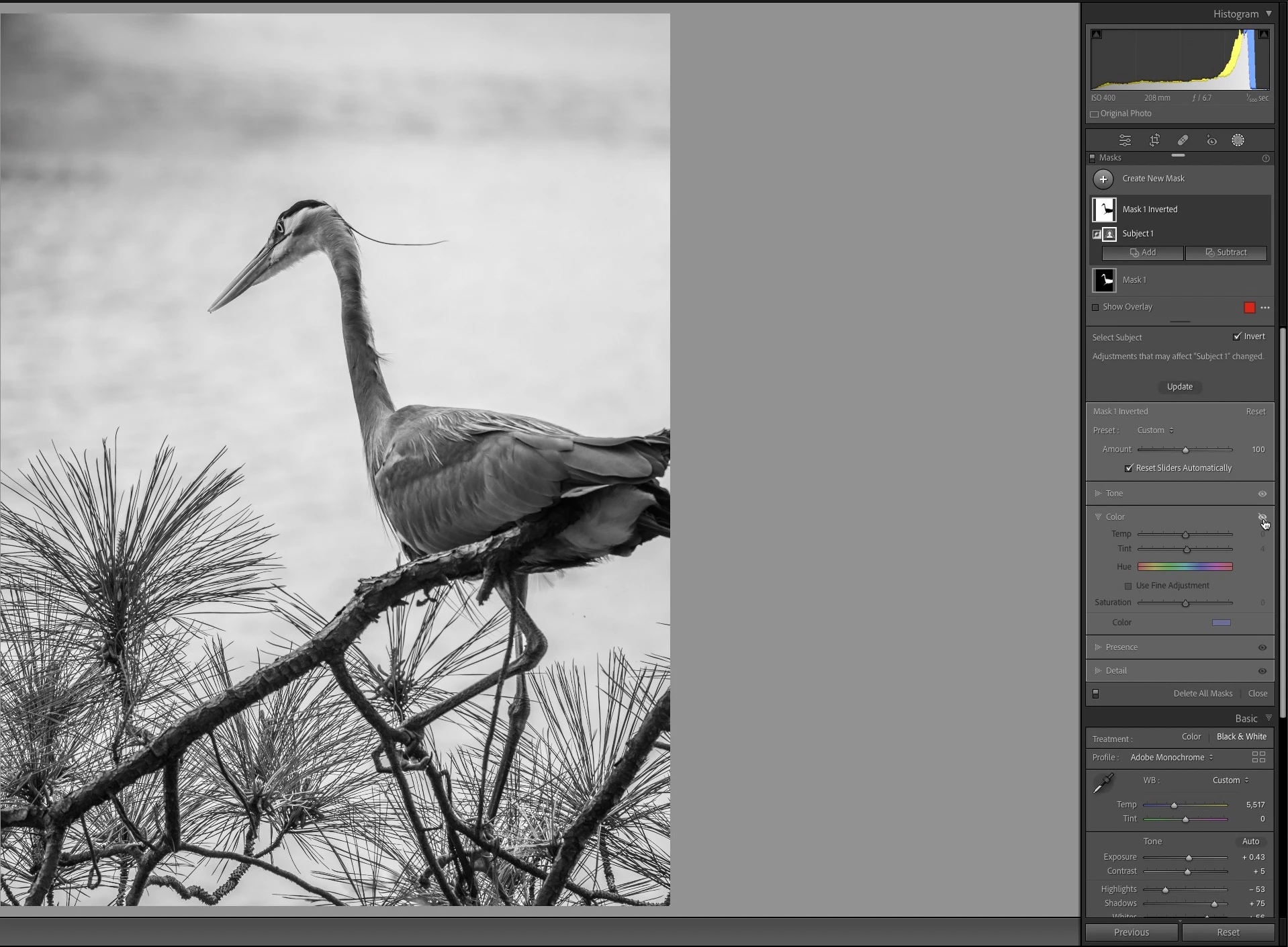 I have an image I have processed in Color that has a mask that was created by inverting an object selection. The mask has a blue color applied (Color in the Color tab). I then converted it to black & white by applying the Black & White Treatment (the Adobe Monochrome was applied but all black & white profiles have the same effect), but the blue color still shows through as blue. Why is this?