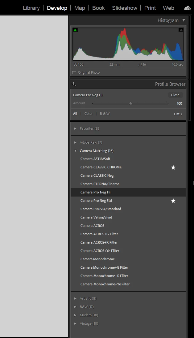 Hi guys! I just got my first Fuji camera, a GFX 50R. From what i understand lightroom should have camera matching profiles that match Fuji's film simulations in Lightroom but they dont show up in my profile browser? As you see in the screen grab its a fuji RAF file, which should have the camera matching profiles? Thanks for any help