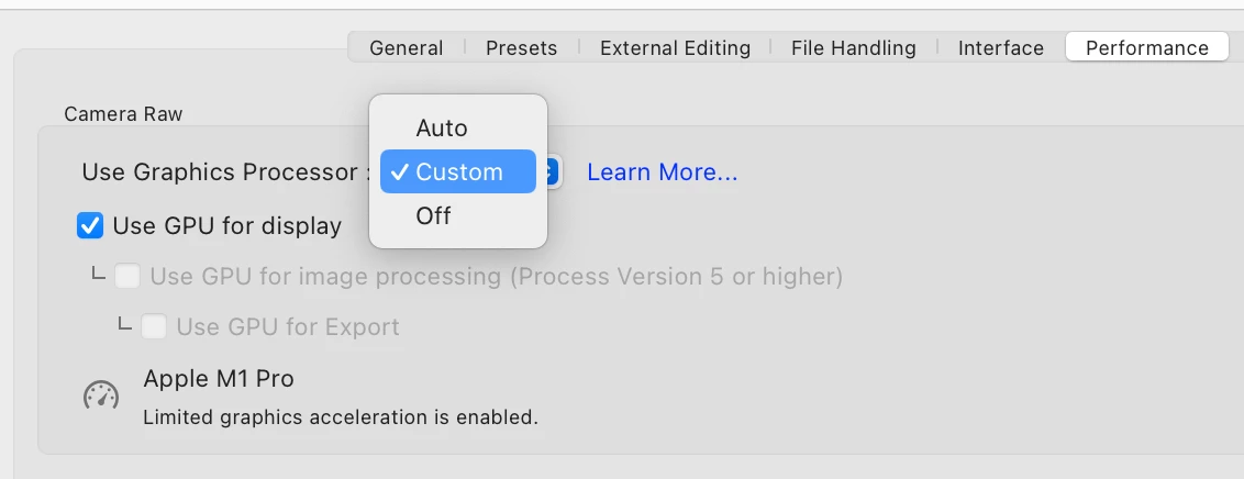 My Mac have M1 Pro processor, 32GB RAM and installed macOS 14.0+ LrC 12.5+ CameraRAW 15.5, all the software is the lasted version. Could anyone tell me how to open the full GPU acceleration? Thank you.