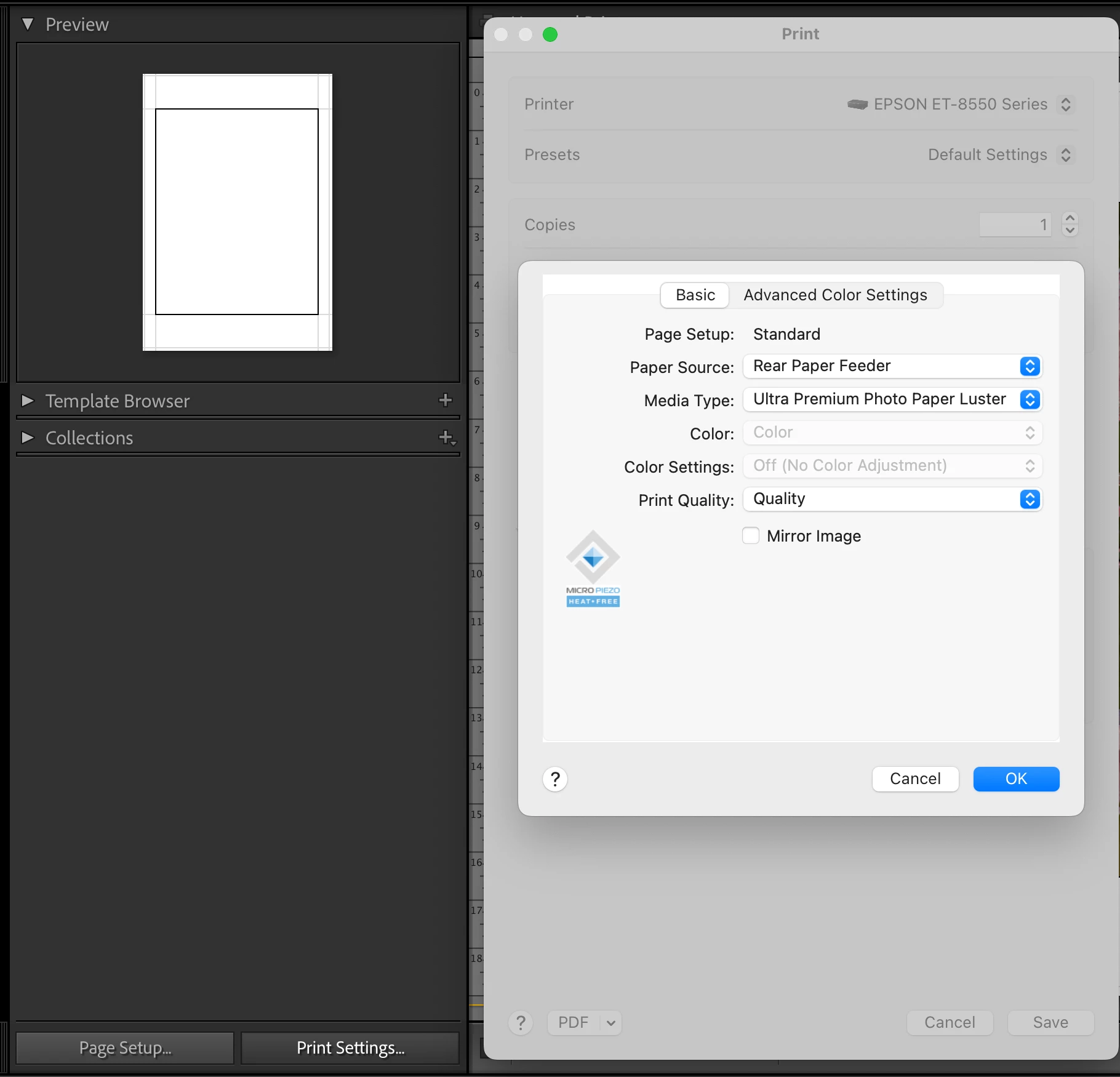 When I go to the right side and select an ICC from the drop down list in the Print Job/Profile drop down, I don't see an ICC for this paper type. (I have carefully gone through the list displayed by selecting "othere"). Selecting any of the displayed papers do not give as good a result as using the epson print layout software on an exported jpeg file of the target file and the Ultra Premium Photo Paper Luster selected in settings. You can see that the Epson print layout software can find a configuration as this paper type as a choice in it's settings list: