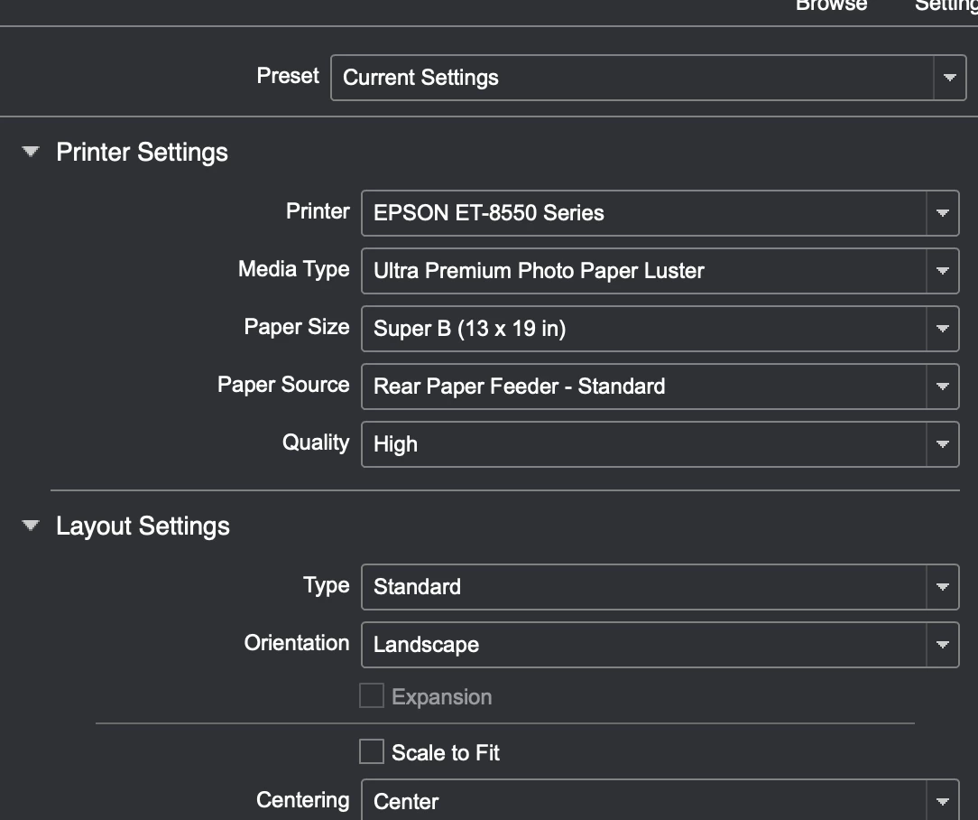 When I am in the print settings panel on the left side of the screen, I get a choice for Epson Ultra Premium Photo Paper Luster: