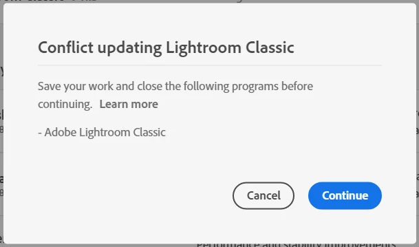 I have tried to install the most recent update to LrC (v 11.5), but I get an error message that says I must save my work and close LrC. It is closed. What now?