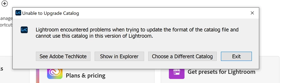 Can't use lightroom classic as can't access catalog. I am getting the following error message: