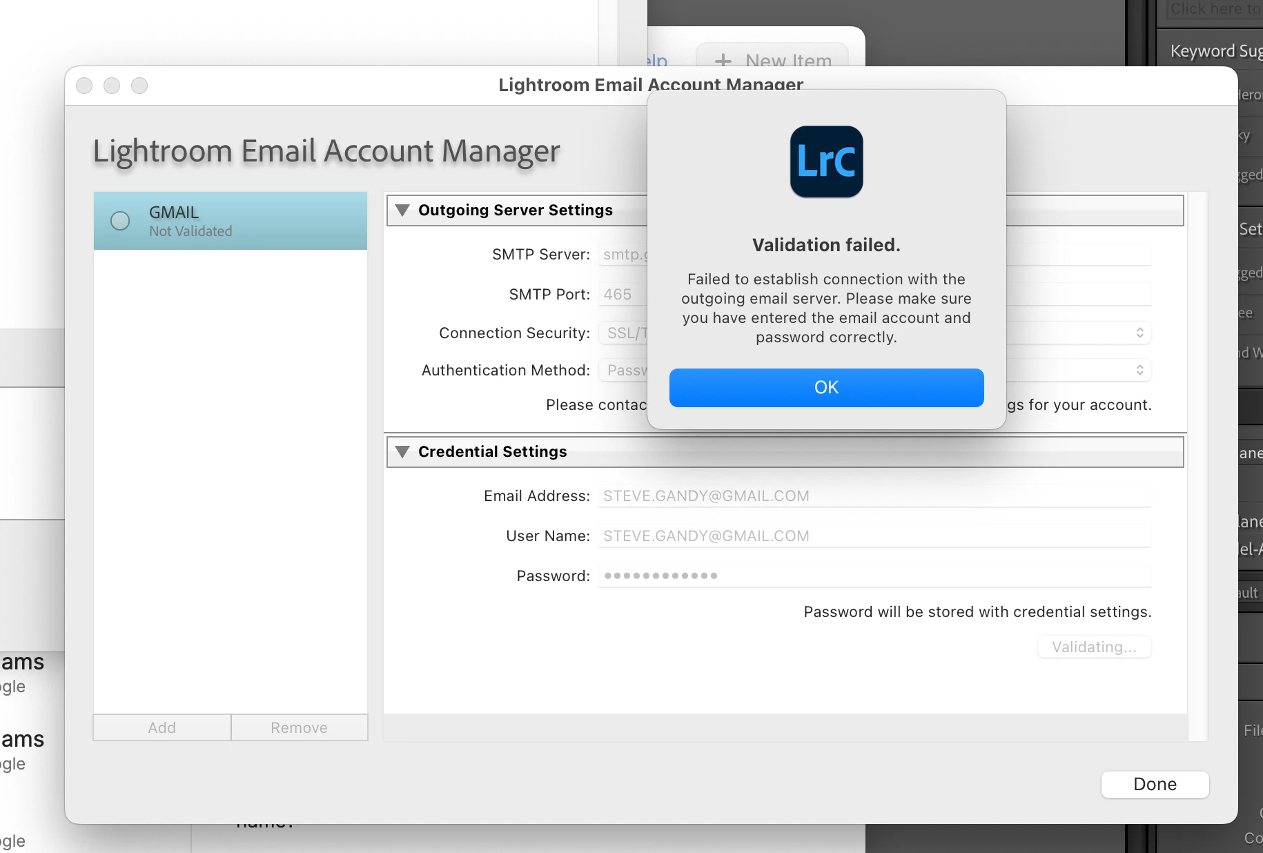 Please try the steps suggested here: https://helpx.adobe.com/lightroom-classic/kb/issue-validating-email-account-lightroom.html