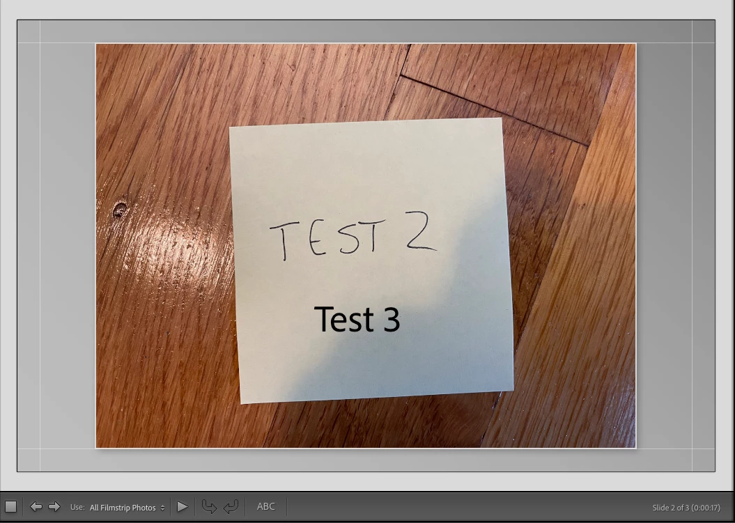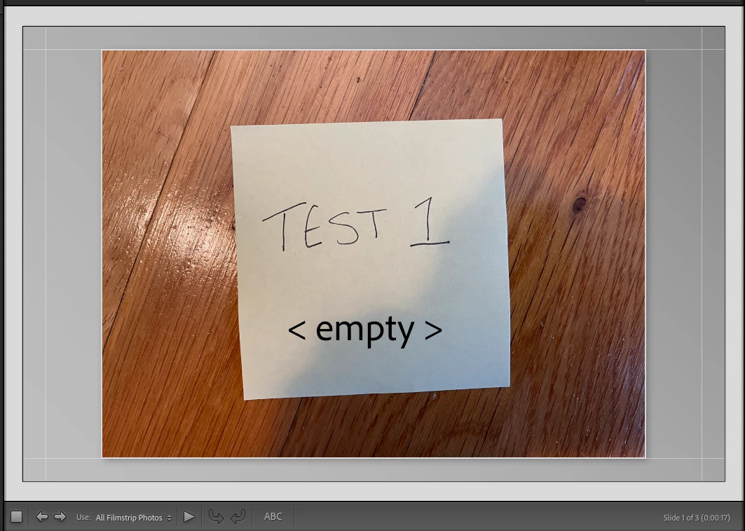 I am having an issue with the caption text not showing correctly in slideshows. I am on a Mac running Monteray. Problem has persisted through multiple weeks, restarting the program, and updating Lightroom Classic to the most recent version just today. I also have tried on a differnt person's computer with their own Lightroom Classic software and images and they have the same problem. The problem only happens in the Slideshow module when arrowing through the slides in the slide editor view. It is essentially showing the caption text from whichever image you viewed last on top of the file instead of the current file's caption. When you move to the next image it changes to the caption from the image you were just viewing. I have attached screenshots to illustrate. The captions match the text in the images. The 1st image shows the caption as empty, then I arrow to the 2nd image and it shows the 1st image's text, I arrow to the 3rd image and it shows the second, arrow back to the 2nd and it shows the 3rd, back to the 1st and it shows the 2nd. When I click on the caption text it becomes correct, but the problem persists if I change slides again. When you play the slideshow or export it to pdf/video the captions display correctly, but it is very confusing to work on a slideshow and have all the text be wrong in the editor view.