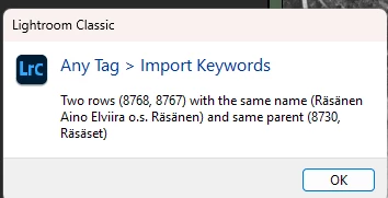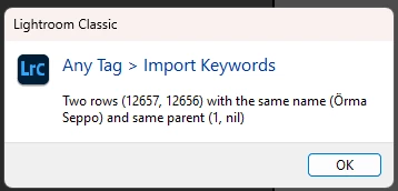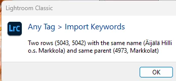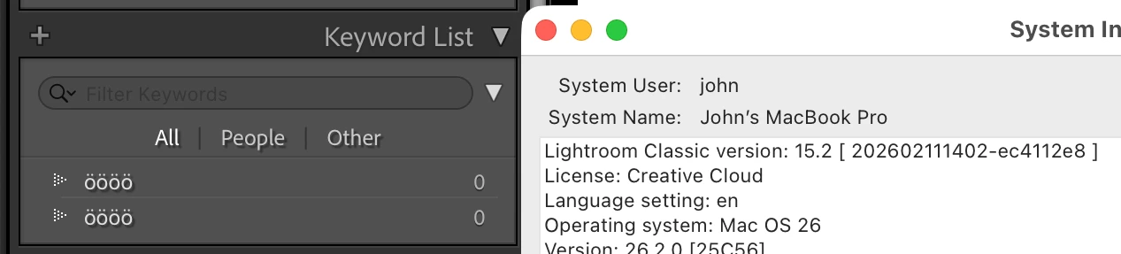 Catalog conversion from Lightroom Classic v14 to v15 consistently fails when the keyword hierarchy contains keywords starting with Scandinavian characters (ä, ö).