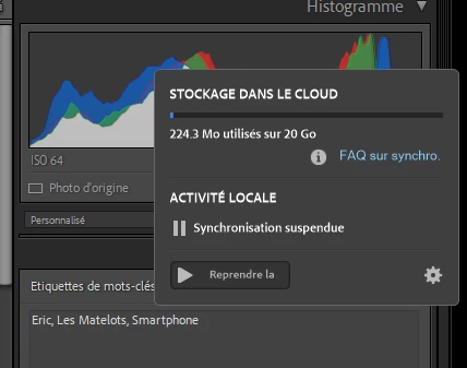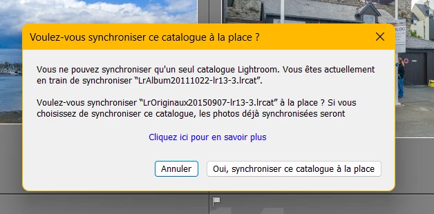 Pour l'autre catalogue, je ne veux pas de synchronisation Cloud. Or, depuis quelques jours, à chaque fois que j'utilise ce catalogue, Lr me signale au démarrage que je ne peux synchroniser qu'un seul catalogue et bloque mon démarrage avec un message que je ne voudrais plus voir.... : "Voulez-vous synchroniser ce catalogue à la place ?"