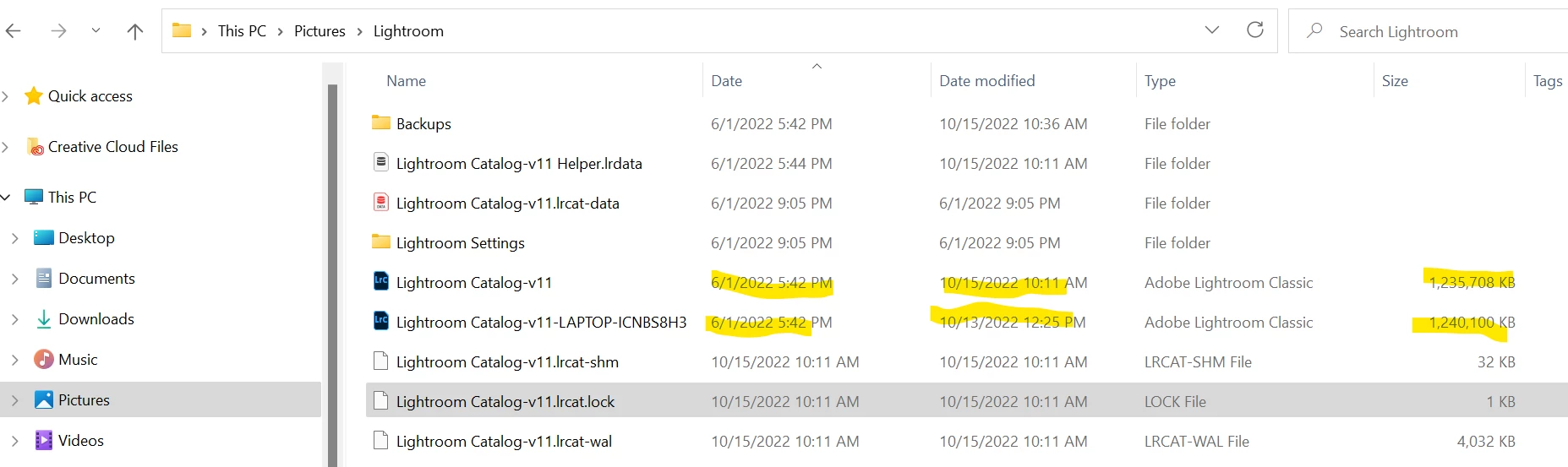 I'm pretty gun-shy at this point after so many struggles so I just wanted to double check my next steps. I'm tempted to move the LAPTOP catalog to a different drive, delete the lock file (task manager says LRC is not running), and try to open LRC. If the regular catalog is good, then I'll delete the LAPTOP catalog. I don't know what the 5000kb difference is between the 2 catalogs, and that bothers me. Am I doing the right thing?