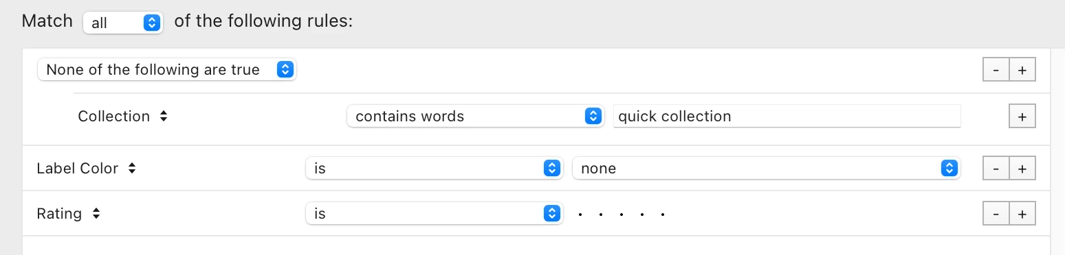 Dans Lightroom, je cherche à sélectionner uniquement les photos qui ne portent ni de libellé couleurs, ni de note et qui ne font pas partie de la collection rapide.