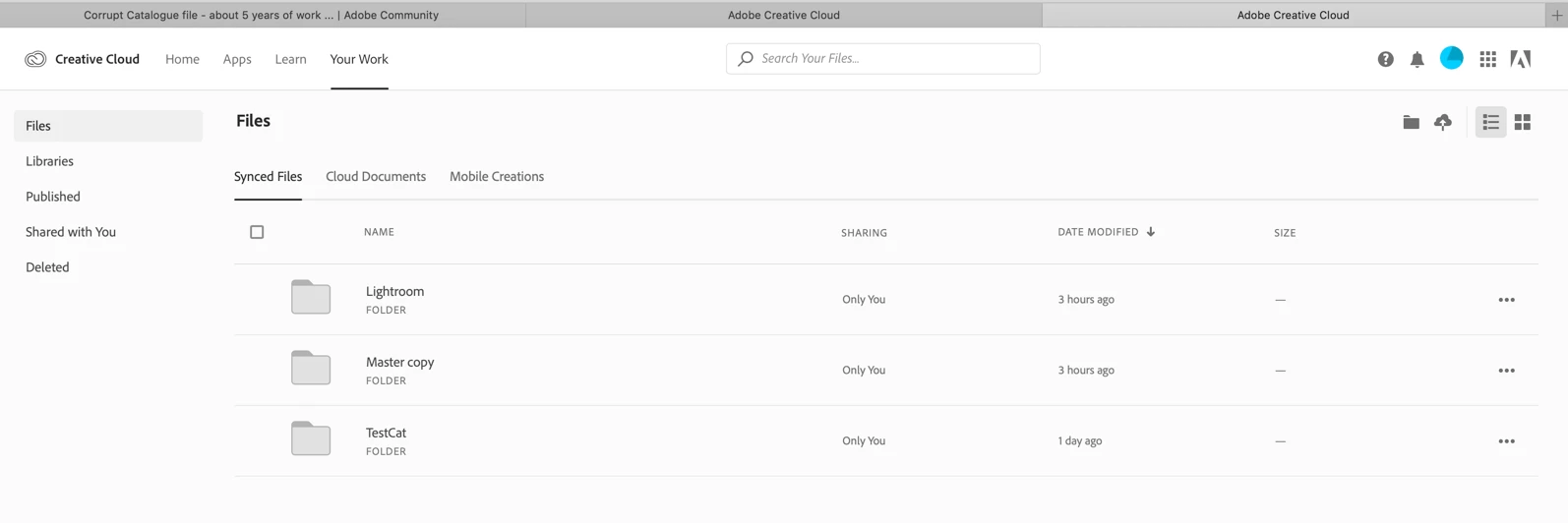 I paused sync on both machines about 3 hours ago. Then I put 3 folders in the Creative Cloud Folder on my iMac Pro. The Test Cat folder contains a catalog with 10 images I created yesterday as a test. The Lightroom folder contains a copy of my original catalog from a 3-month-old backup that I have not tried to open in either computer yet because every catalog that I have opened so far has caused Lightroom to crash and corrupt the file. The Master copy folder is a new catalog that I created on the iMac pro from my external drive that stores all of my images. There are no collections and I am not sure that all of the photo edits have been preserved.  It took the web about 3 minutes to sync up.