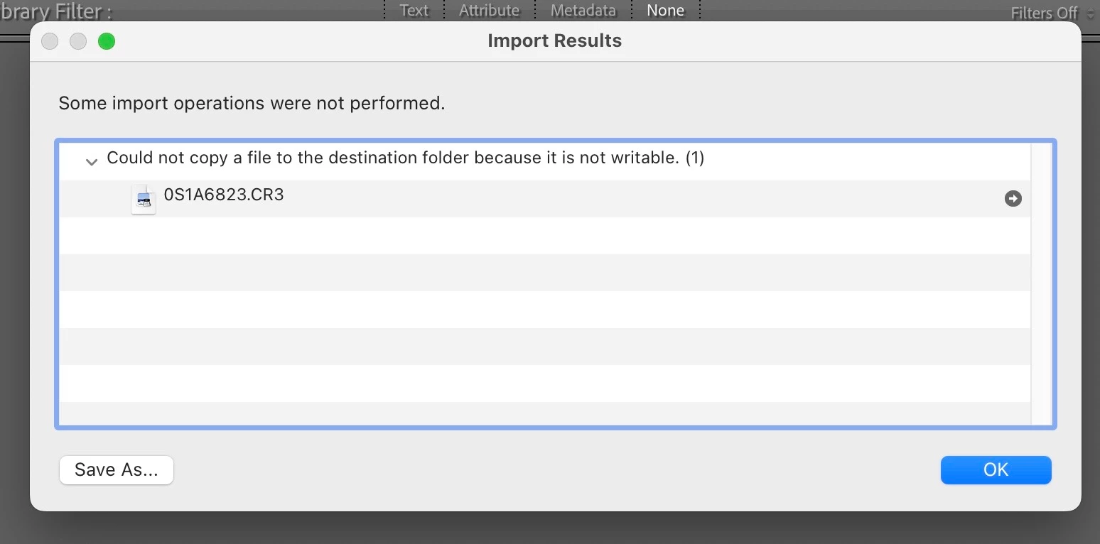 "Could not copy files to the destination folder because it is not writable" so, I have updated both Mac software and Lightroom, I have change the permission to Read & Write on the specific destination folder, I have restarted the laptop a couple of times just to make sure an update wouldn´t pop up and still nothing. I am writting in the off chance that this may have happened to someone before.