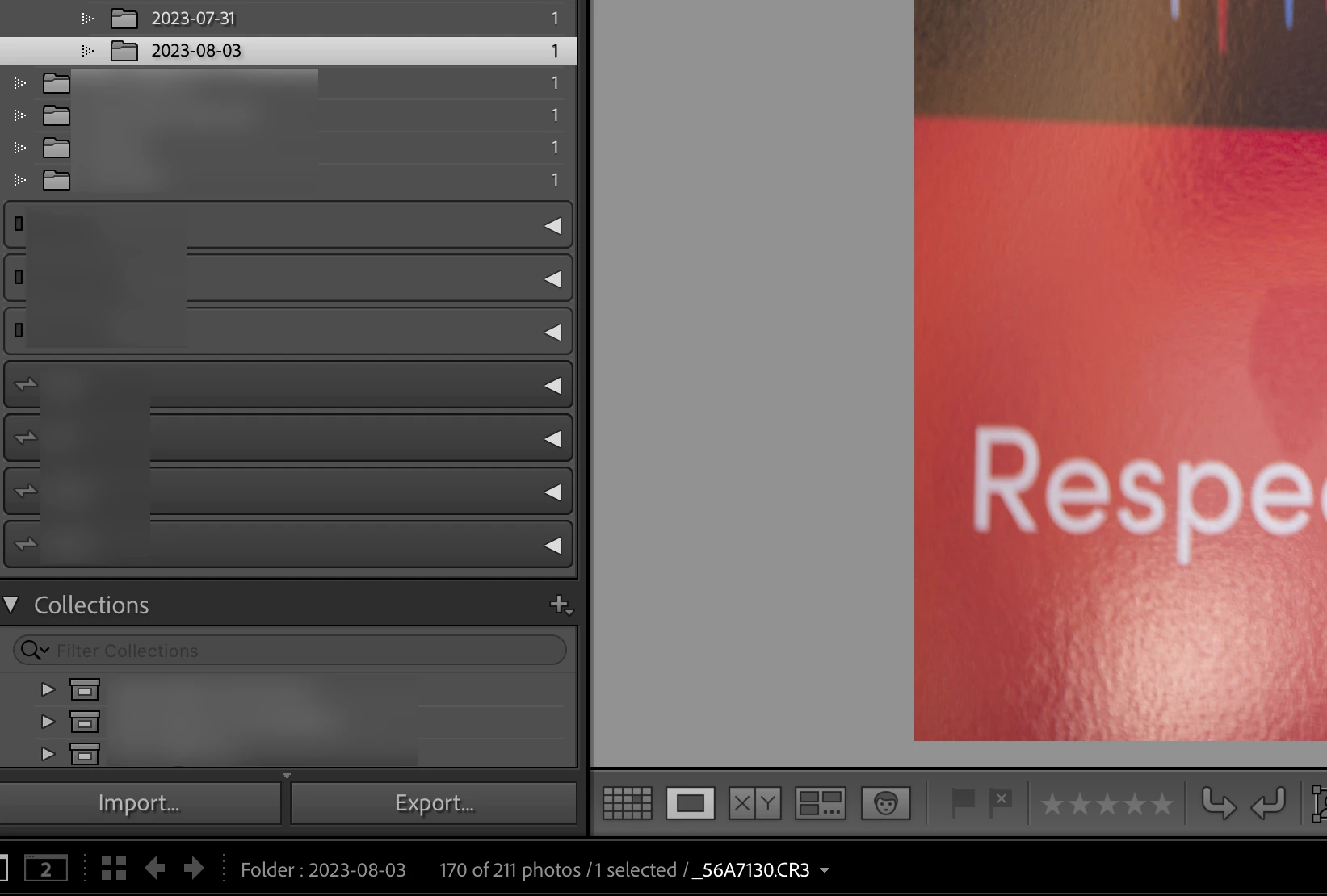 In the screenshot, I've already imported from two cameras and have 211 images in that folder (ie. 170 of 211 in the filmstrip). However, when you look in the folder under collections side bar, it is only saying there is 1 image in that folder. So there is a discrepancy with the count displayed in the two different places.