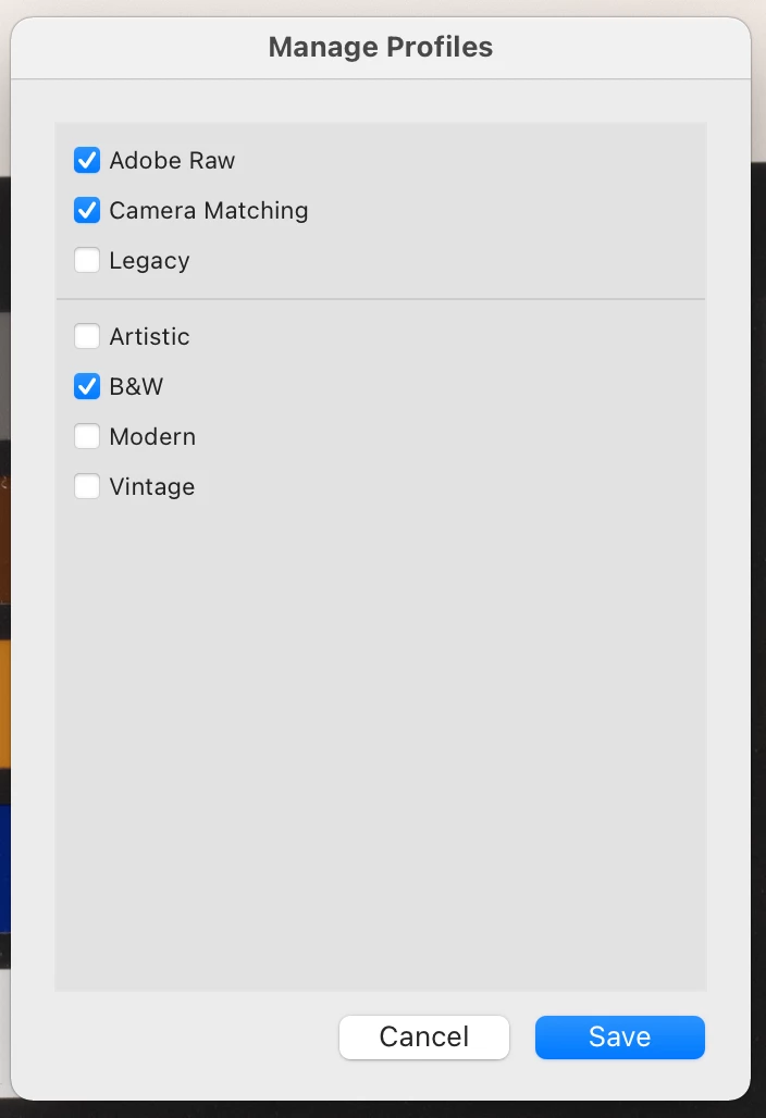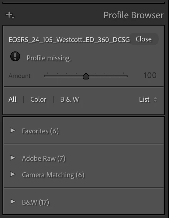 I regularly make custom camera profiles (.dcp) with a third party software and use them in Develop presets. These profiles always appear in the Profile Browser grouped under a "Profiles" drop down menu. On 2 separate computers, running different versions of LR Classic but logged in as same user, all of the custom profiles that had been loaded and available for use have all gone "missing" from LR. The .dcp files have not been moved or deleted, they still reside in the proper folder location on the computers but LR seems unable to see them. And the "Profiles" drop down menu has completely disappeared from the Profile Browser and from the "Manage Profiles" menu.