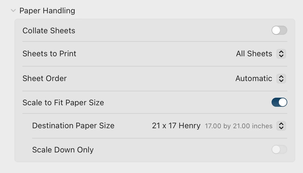 I thought it it had to do with the "Paper Handling" area of the "Print Settings"?