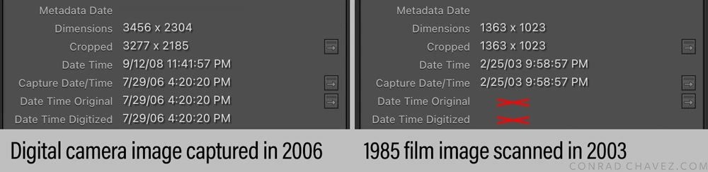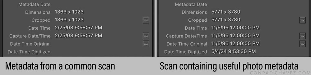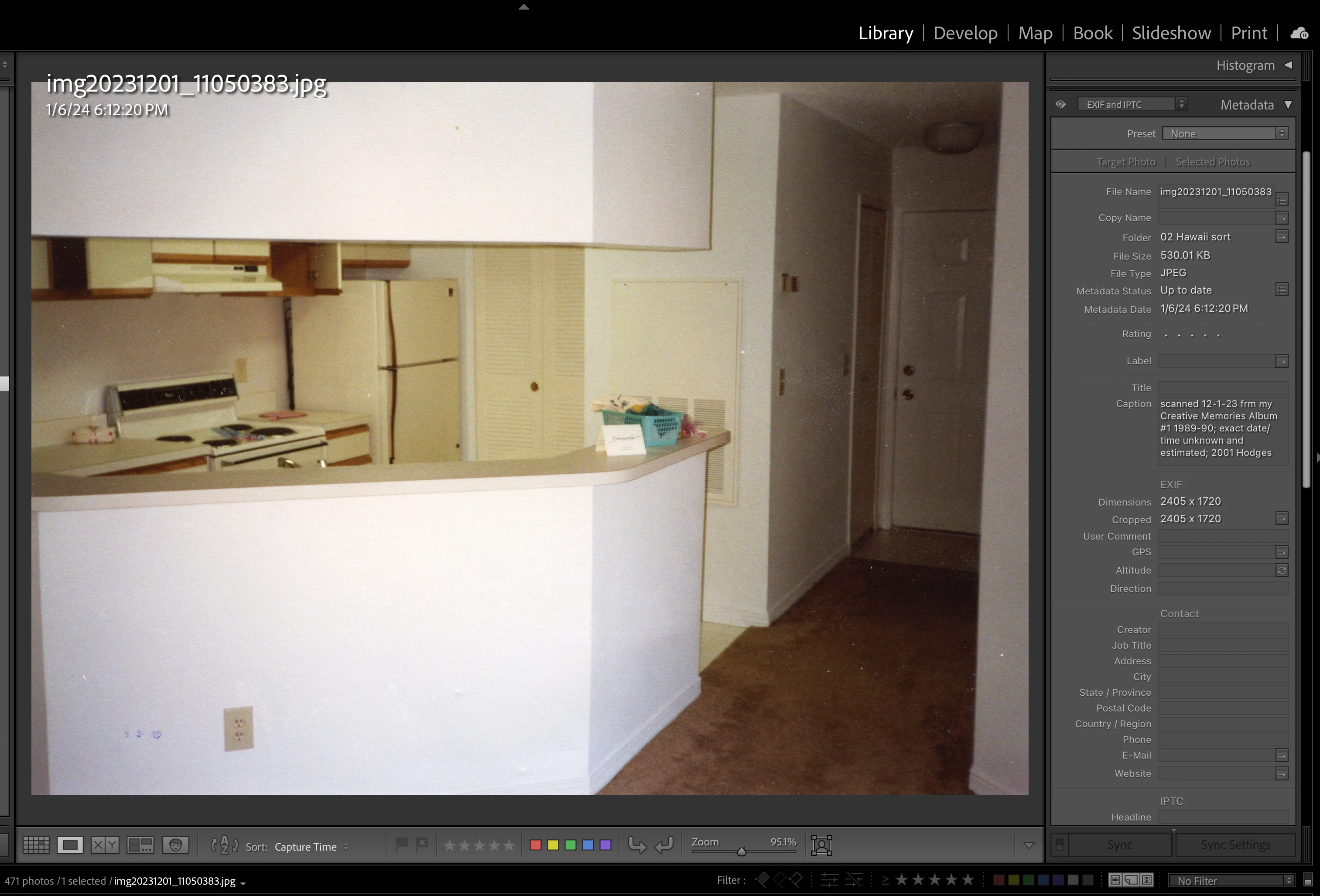 Here is a screenshot of a photo and metadata as it was after I scanned it but before I added a keyword with the "Metadata Date 1/6/24" which is the date it was imported.