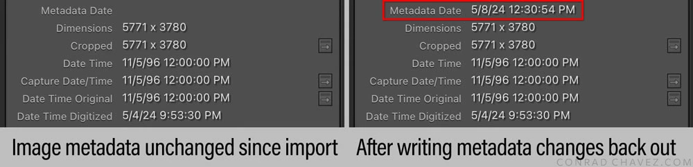 Here it is after, with the new "Metadata Date 5/7/24". I did not change the date. LR instantly replaced it with the time of the edits.